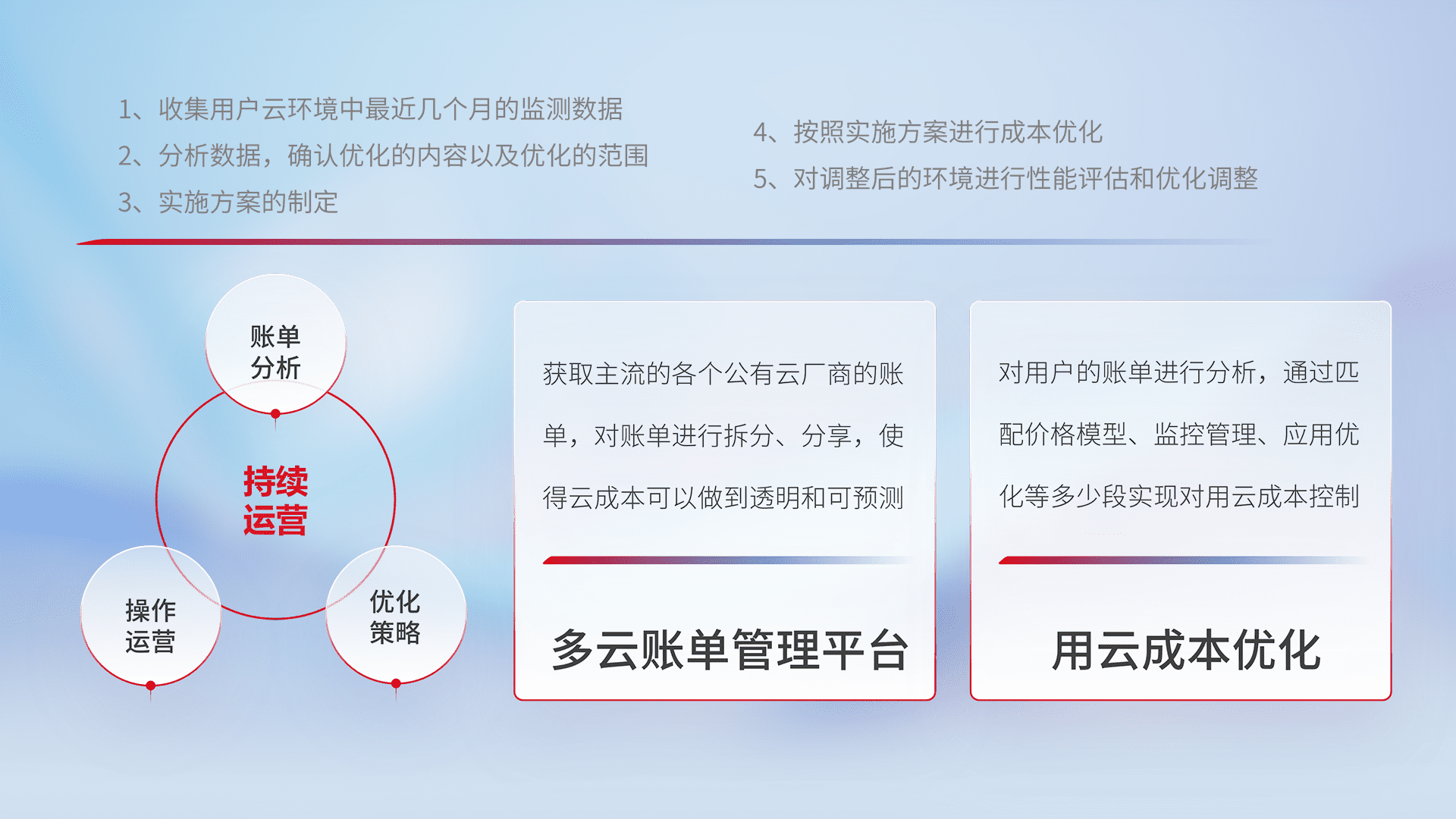 通过多云纳管,,以统一的资源数据模型把客户的云资源进行抽象和封装,,进而实现对多云资源的统一操作,,,,保障云资源管理的可靠性、、稳定性与可用性。。量身定制化运维内容,,配置、、、开发运维、、补丁管理、、、、备份、、、监控、、、、认证和访问管理、、、、审计和日常巡检等,,保障在用云过程中的可靠度,,稳定度以及高可用率。。
